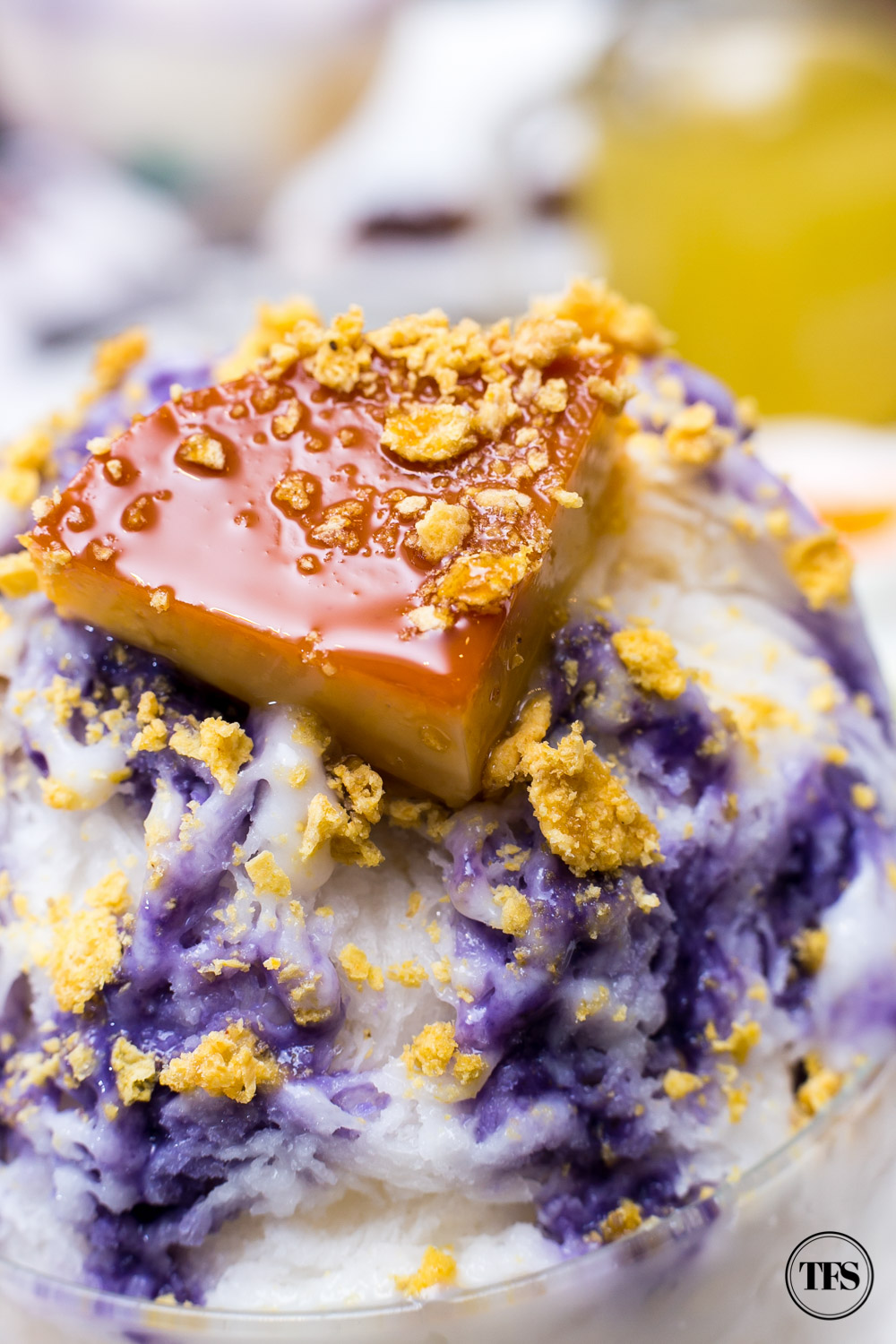 Projecting a classic pinoy halo-halo, ingredients like sweet and meaty macapuno strings, red and green nata de coco, caramelized saba, velvety ube jam, and glazed langka cannot be missed out. You have to dig using your spoon as you find them under the mountain of creamy and milky ice. On top, it has a thick chunk of homemade leche flan, sprinkled with crunchy corn flakes and drizzled with ube cream.