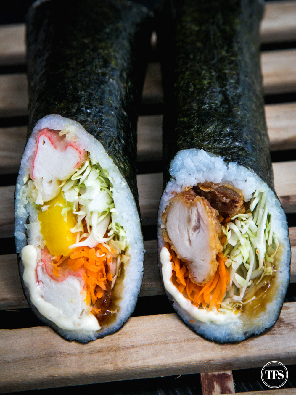 For california maki lovers, this California Kani Tempura Makirrito is a serving of tempura crabsticks, ripe mangoes, shredded cabbage and sliced carrots. Deliciously drizzled with special Japanese sauce and mayonnaise, all wrapped in sushi rice and nori for a complete burrito spin. This variant has a sweeter flavor than the karaage makirrito. Since they’re both good, it’s hard to pick between the two.