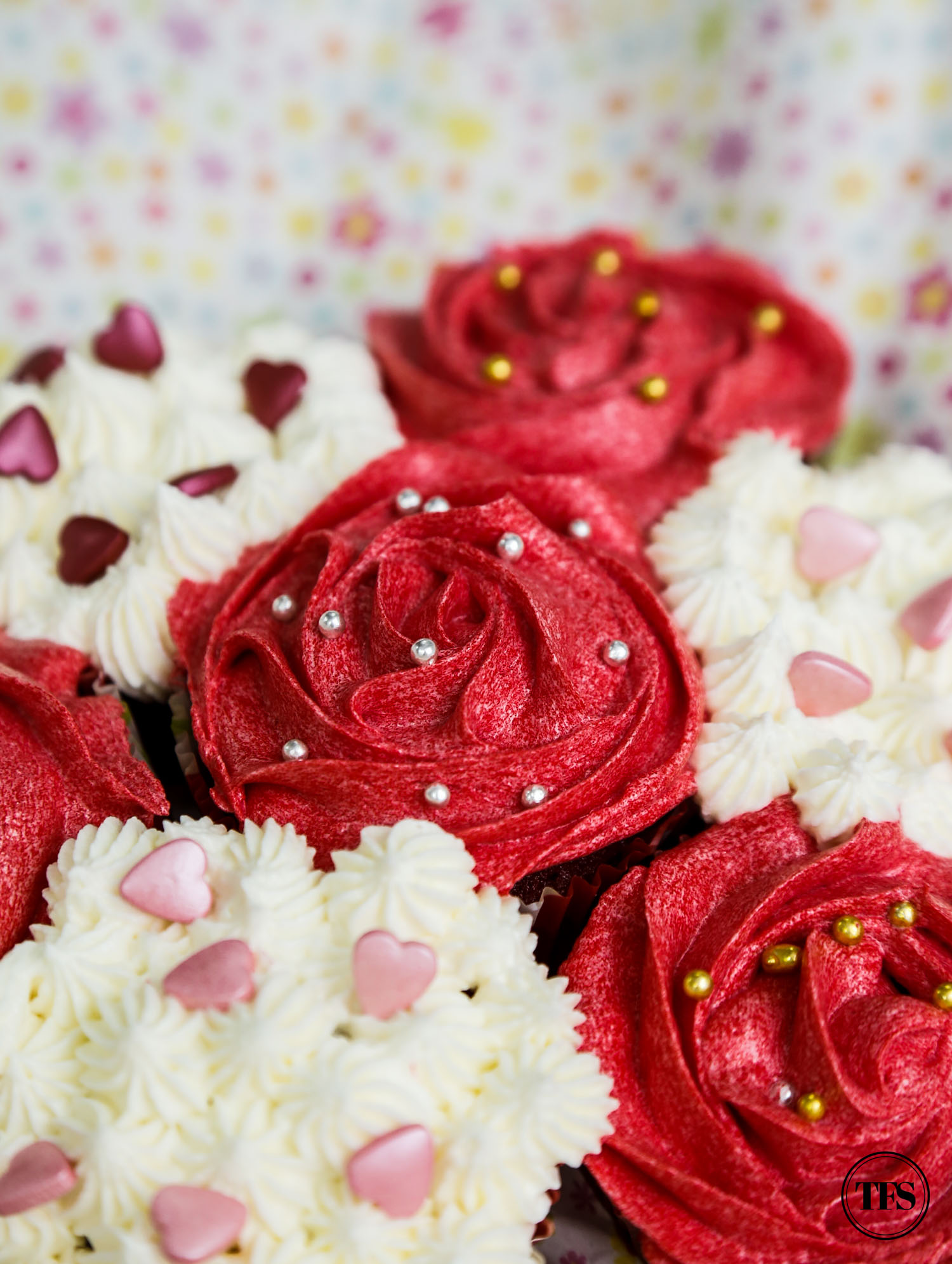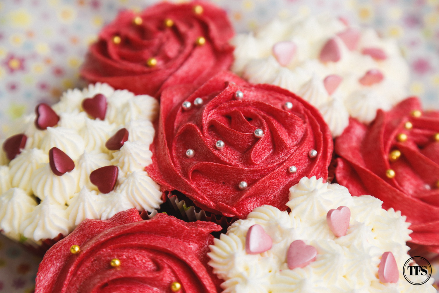 5. Pipe frosting onto cupcakes and form according to your flower design. Add red or pink garnish to complete the Valentines look.