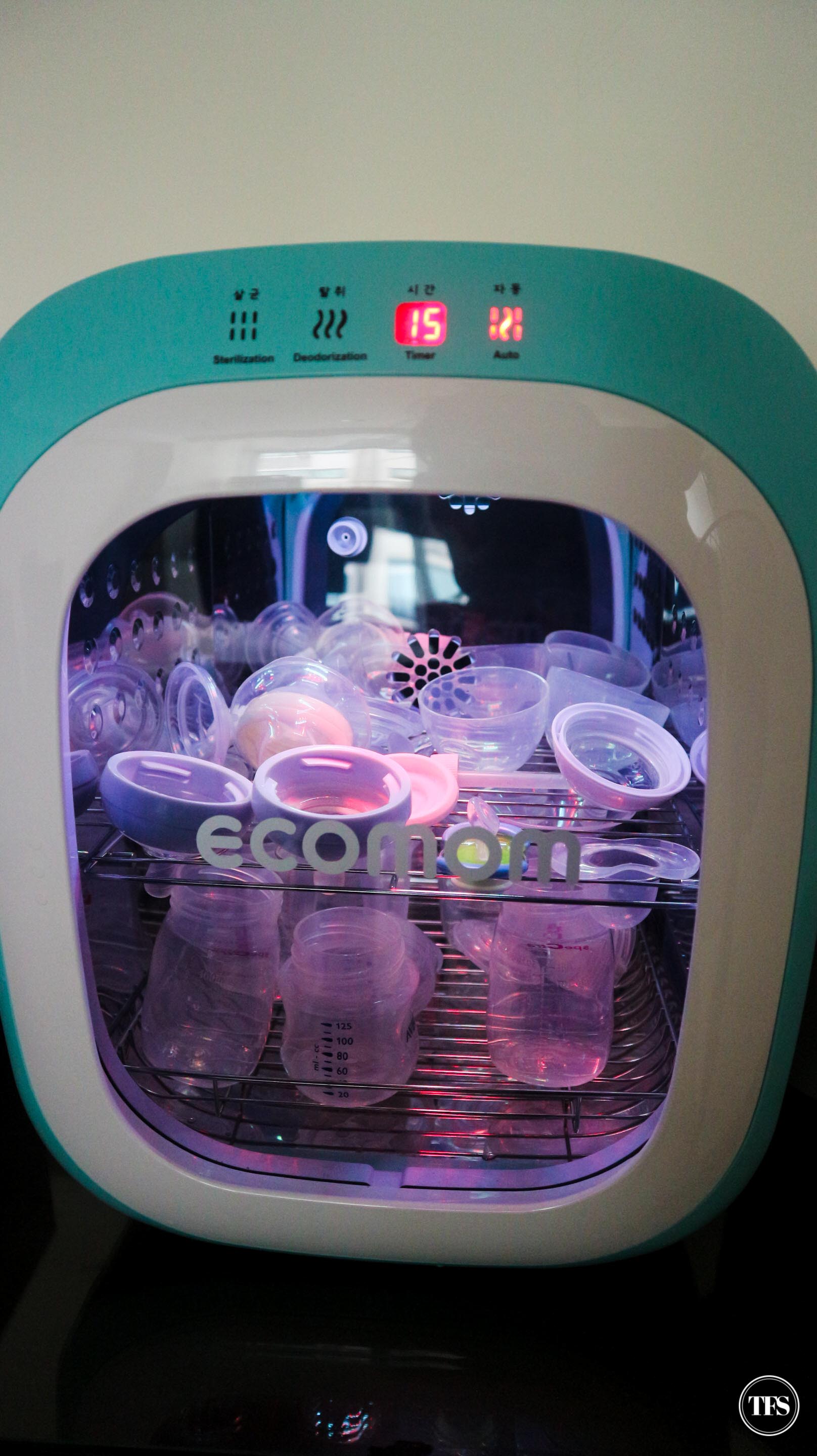 Since serilizing is part of our everyday routine, it’s important to know that the sterilizer we use is easy yet safe to use. Ecomom has no risk of burns since it doesn’t use hot water or steam. No complications in using the UV device, even our helper understands how it works right away. The touch screen technology lets us choose the icon which mode we prefer. What we always use is the Auto Function, a combination of everything we want to do with our bottles – sterilization and drying.
